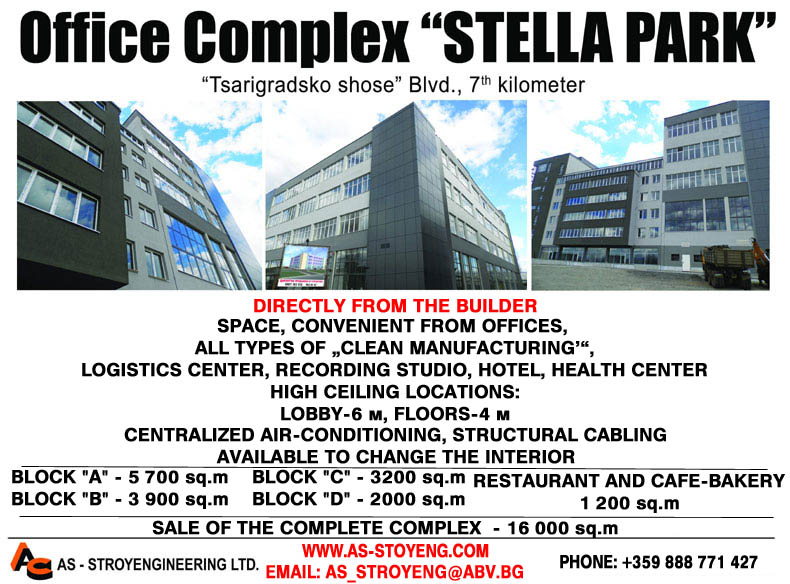 The Office Complex "Stella Park" is located on regulated plot- II, 9, blv."Tsarigradsko Shose 7-th kilometer" in a close proximity to ZIT and Office 1 Super Store. This is the Hi-tech zone in Sofia, which is one of the fastest growing places in the capital. The location is extremely communication accessible. It is equipped with a brand new hydropower station, optical cables, electric power station, and new water supply and sewerage. It is surrounded by top-notch roads. It is location at the half-way mark between the Center of Sofia , the Airport, the Roundabout freeway, and the two highways connecting the main cities in Bulgaria.